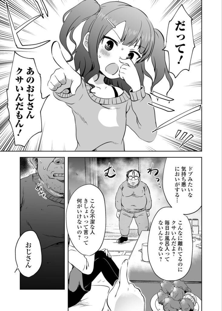 物語の主人公は、風呂にも入らず自室にこもり続ける中年ヒキニートの「たかし」。親戚一同が泊まりに来ることを嫌がり、母親に激昂する彼の前に現れたのは、美しく成長した姪の「るな」でした。彼女はたかしから漂う耐え難い異臭に顔をしかめ、「クサいし、皆の迷惑だから出ていって!」と、たかしの存在そのものを否定するような言葉を投げつけます。この屈辱に震え、自室で涙を流したたかしの心の中で、何かが音を立てて壊れました。『理解(わか)らせてやる……!』。彼が選んだ復讐は、自身の肉体から生み出される「究極の不潔」を用いた、あまりにも非道な大凶行だったのです。