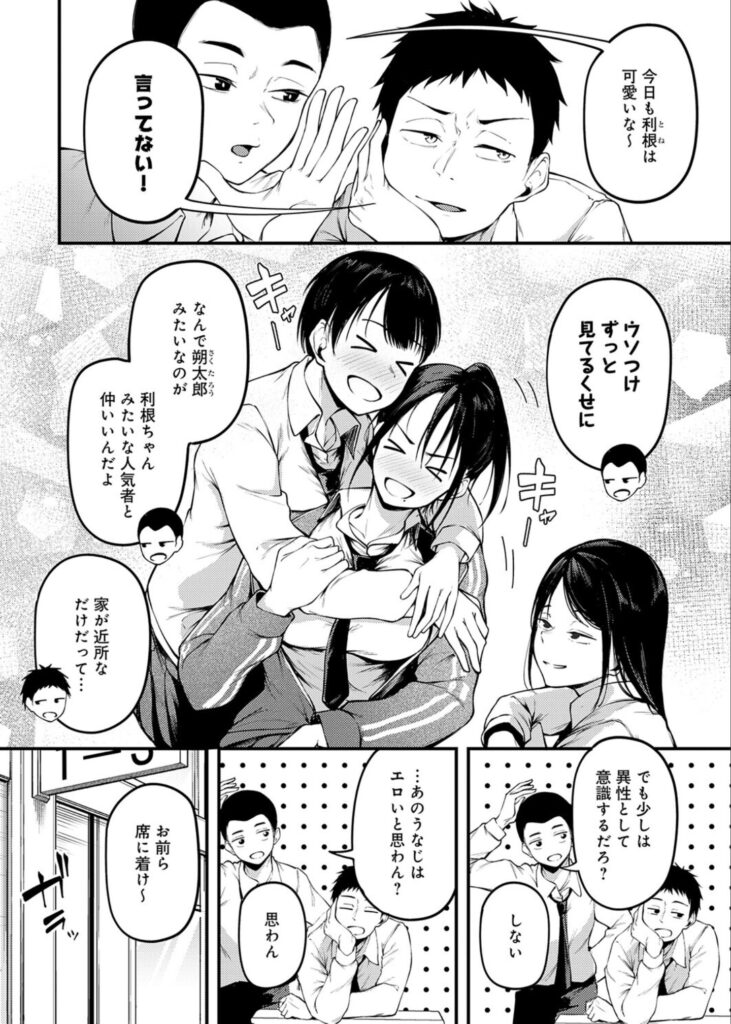 主人公にとって、クラスの人気者・利根は「たまたま同じ時間を過ごしてきただけ」の幼なじみ。自分の気持ちが恋なのかどうかも向き合わないまま、停滞した日常を過ごしていました。しかし、その均衡はチャラい転校生・玉村の登場によって無慈悲に破壊されます。利根が玉村と付き合い始めたと知っても、自分に言い聞かせる主人公。「俺にとってはただの幼馴染だ」と。しかし、放課後の無人の教室。そこで、憧れの制服に身を包んだ彼女が、玉村に対して献身的にフェラをする姿を覗き見てしまった瞬間、彼の世界は音を立てて崩れ去ります。自分が触れることすらできなかった彼女の「女の顔」が、そこにはありました。