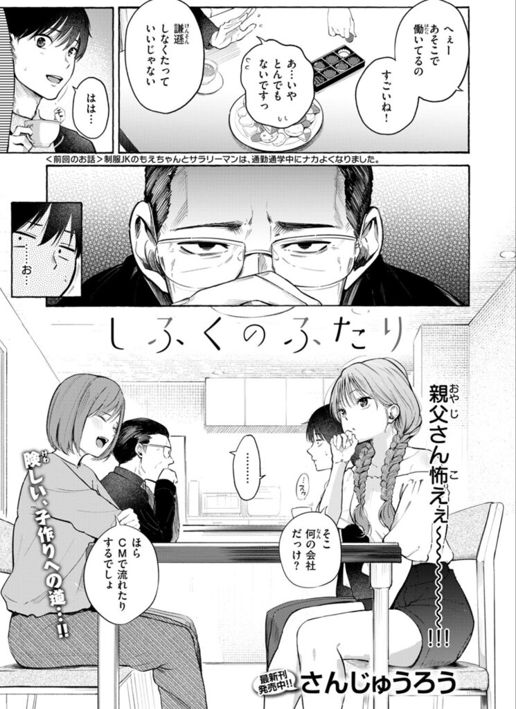 隠キャ系読者の「夢と希望」を具現化し、「初めてレビューかくくらいいい作品でした」と絶賛されたさんじゅうろう先生の傑作単話『制服とスーツ』に、待望の続編が登場しました。それが、こちらの『しふくのふたり』です。前作で多くの読者の心を鷲掴みにした制服姿のヒロイン・もえちゃんと、年上のスーツの彼との甘く背徳的な関係性が、さらに一歩踏み込んだシチュエーションで描かれます。