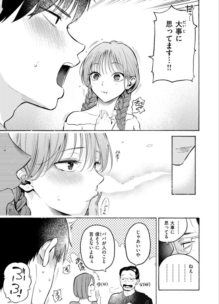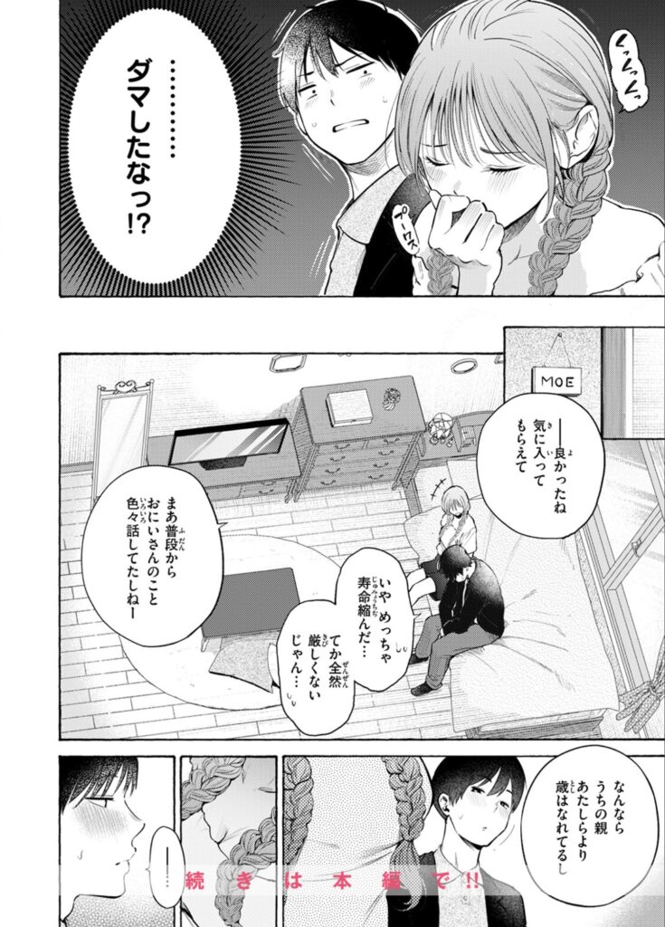 主人公は、もえちゃんの親御さんに会うことでめちゃめちゃ緊張していますが、もえちゃんにあっさり受け入れてもらったことで緊張もほぐれます。そして、親御さんが階下にいるという、最も背徳的な状況の中、もえちゃんの部屋で二人きりになった瞬間、彼女は「口でしたげる」と、とんでもない提案をしてきます。