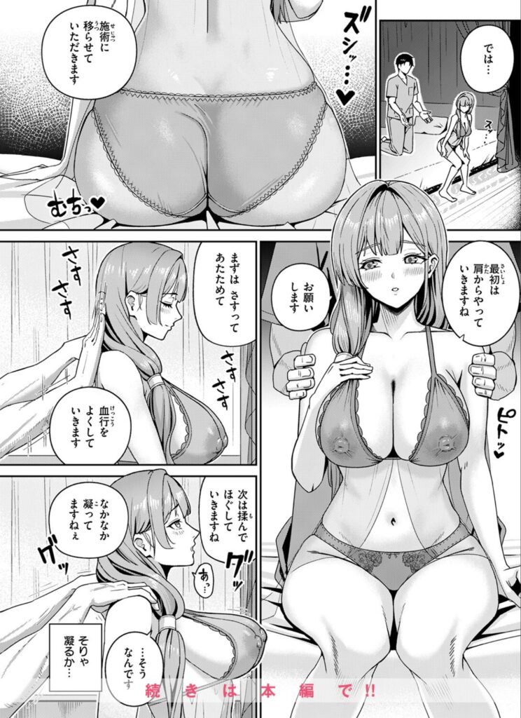 物語の主人公は、独立したばかりの訪問マッサージ師。大きな期待と少しの不安を胸に、新規顧客の元へ向かった彼を待っていたのは、大使館と見紛うばかりの大豪邸でした。「ここを常連にできれば商売繁盛間違いなし」と意気込んでインターホンを鳴らした彼を出迎えたのは、目を見張るような巨乳を携えた、美しすぎるお嬢様・令嬢。しかも、初対面のはずの彼女は、なぜか最初から隙だらけの様子。出されたお茶を飲み、いざ施術を始めようとすると、彼女はあろうことか、薄いランジェリー(ネグリジェ)姿に着替えて現れたのです。高まる鼓動、そして収まらない股間の熱。彼は気づきます。「あのお茶に、何か仕込まれていたのか……?」と。