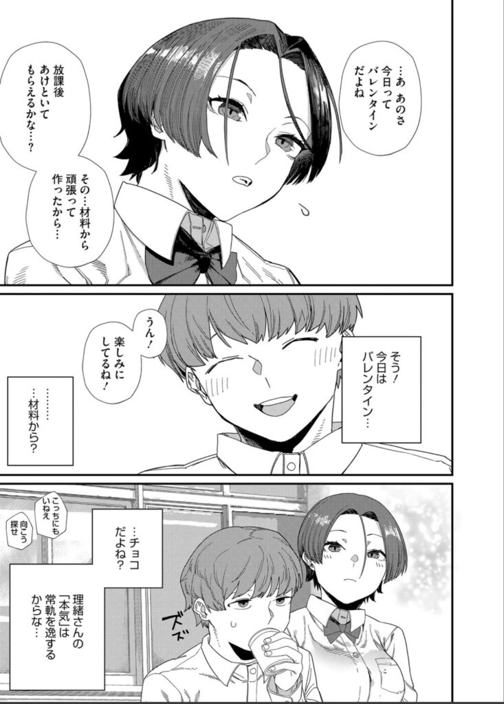 理緒さんは、バレンタイン当日に僕に対し「放課後、あとで貰おうかな?」とチョコを作ることを示唆します。しかし、その愛情表現は教室での大胆な行為にまでエスカレートしていきます。