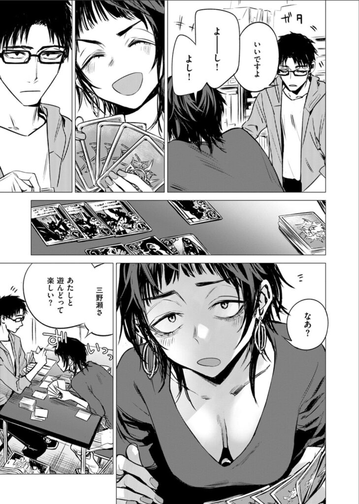 物語は、サークルの先輩である二喜島(にぎしま)が、後輩の三野瀬(みのせ)を麻雀の数合わせで呼び出すところから始まります。二喜島は表情に全て出てしまうためゲームにならないと突っ込まれるタイプですが、三野瀬は終始ポーカーフェイスを貫くクールな後輩です。